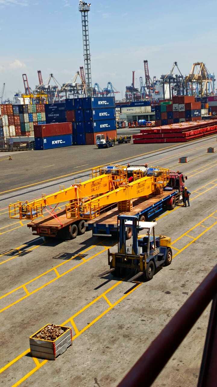 Di tengah hiruk pikuk aktivitas terminal peti kemas, kami menjalankan tugas stevedoring untuk kargo konstruksi berbobot tinggi. Komponen struktur baja seperti spreader beam diturunkan langsung dari kapal dan ditempatkan ke atas truk dengan manuver yang cermat.